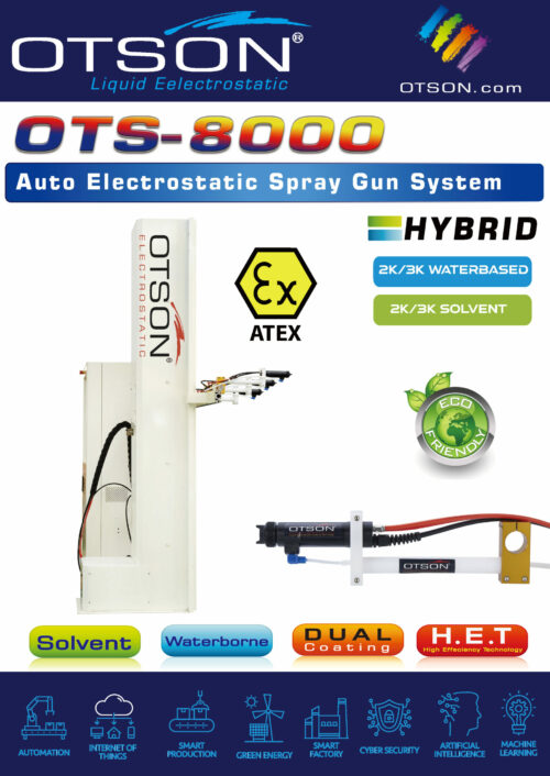 The OTS-8000 Auto Electrostatic Spray Gun System is suitable for use in a wide range of industrial settings, including automotive, industrial, and marine applications. The system is designed to be safe and compliant, and it is certified by Atex, which is the standard for equipment and protective systems intended for use in potentially explosive atmospheres.