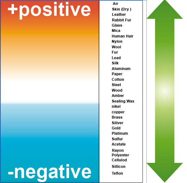 When two materials contact and separate, the polarity and magnitude of the charge are indicated by the materials’ positions in a triboelectric series. The triboelectric series tables show how charges are generated on various materials. When two materials contact and separate, the one nearer the top of the series takes on a positive charge, the other a negative charge. Materials further apart on the table typically generate a higher charge than ones closer together. These tables, however, should only be used as a general guide because there are many variables involved that cannot be controlled well enough to ensure repeatability. A typical triboelectric series is shown in below table.