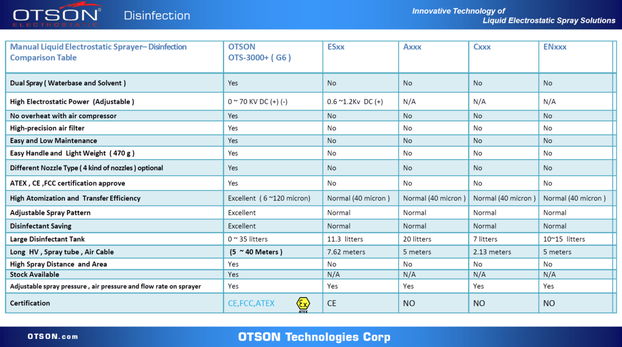 This “wraparound“ effect is so powerful that, with some objects, disinfectant spray can be observed to ‘wrap around’.In this way, the purpose of the electrostatic disinfectant is achieved which can offer transfer efficiency up to 95% and minimize the over spraying phenomenon obviously. OTSON is keeping research and developments in electrostatic equipment in last 38 years, the technologies of OTSON electrostatic can now also be used for waterborne / solvent disinfectants